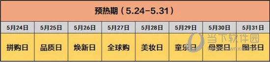 本次为5月24日-5月31日,每天一个主题日,由拼购日开始。活动期间,好货1元超值起拼,超市9.9元抢好物,全球购3件7折,电脑数码预付定金1元最高可抵618,运动户外领券满499减100,家居建材领券满999减120,家居日用满199减100,美妆每满199减100,个护最高99元选10件,小龙虾99元3盒,宠物用品每满99减30。