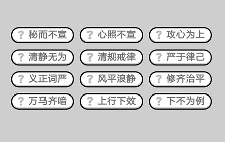 秘而不宣、心照不宣、攻心为上、清静无为、清规戒律、严于律己、义正词严、风平浪静、修齐治平、万马齐喑、上行下效、下不为例。