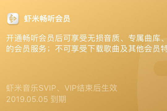 获得畅听会员的用户首次进入虾米会员中心会弹窗提示“畅听会员已开启”,账户若只拥有畅听会员,则页面会直接显示【T】标识和到期时间,若账户还有SVIP/VIP,则需要点击“已开通N种会员”字样进入查看畅听会员具体的到期时间。