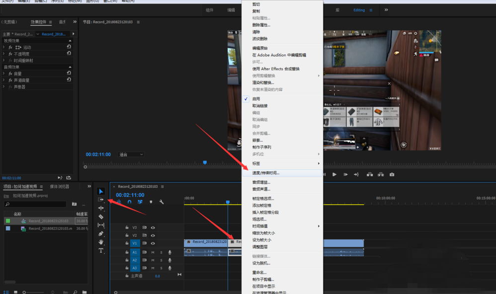 点击选择工具(箭头指示的那个),选中你要加速的视频片段,右击鼠标,选择速度持续时间,如图,