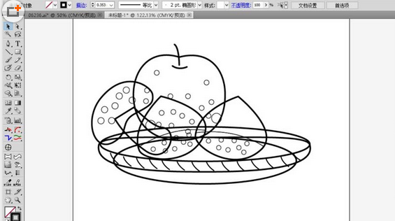 接着继续画出果盘当中大苹果,还有表皮上面的细节路径。