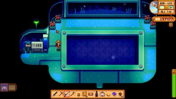 在这个夜市里,你可以找到一艘可以前往深海的船,跟舰长对话即可让你前往深海钓三种新品种的深海鱼.