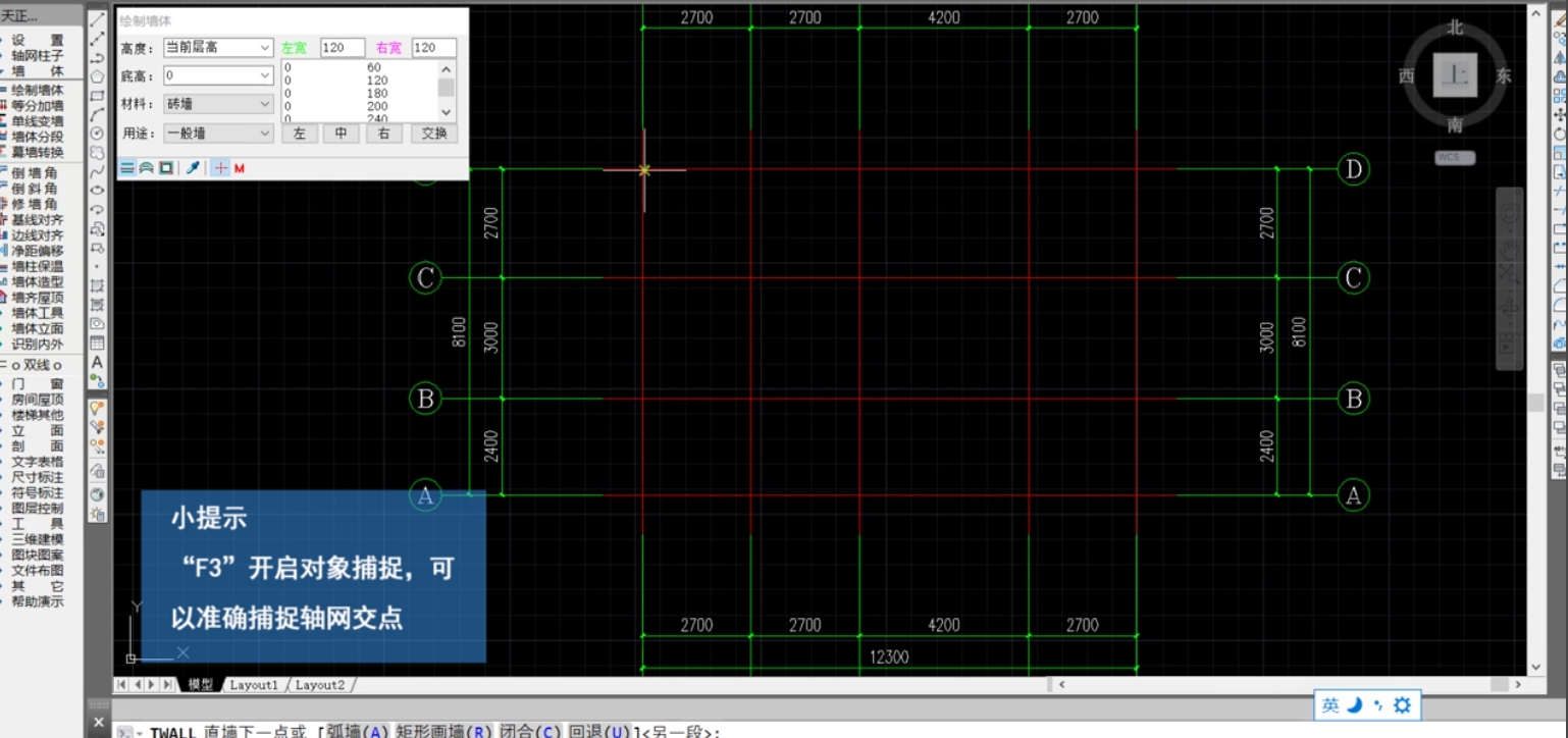 4、完成设置后,将鼠标移动到绘图区,鼠标左键单击墙线起点拖动鼠标进行绘制,鼠标左键单击可确定转折点。按“F3”可开启对象捕捉,准确捕捉轴网交点。