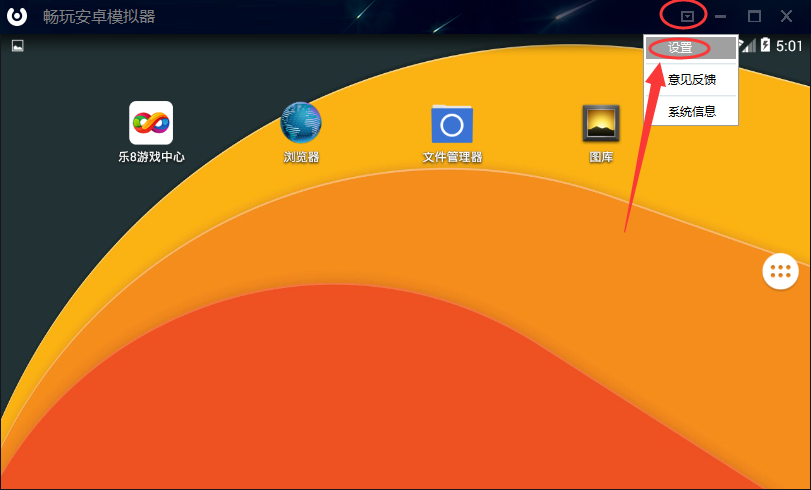 1、首先打开畅玩安卓模拟器,然后在其界面右上角的“菜单”中打开“设置”;