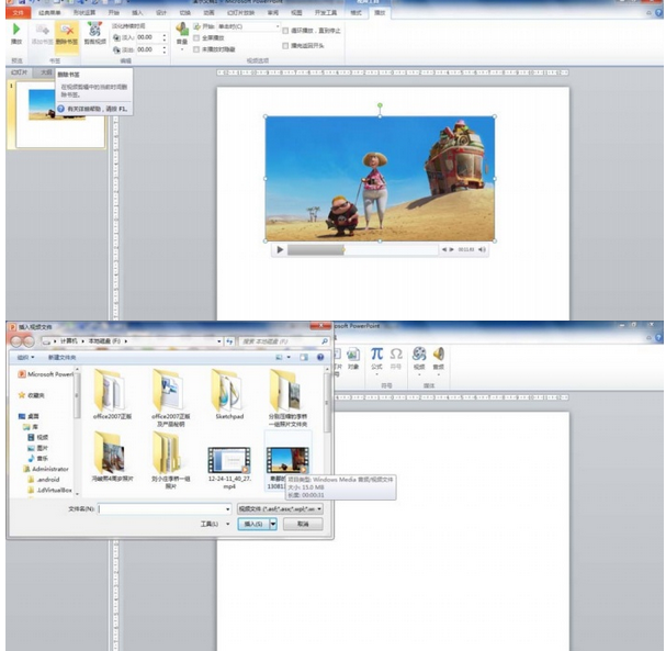 弹出“插入视频”对话框,找到并选择保存的视频文件,单击“插入”,视频窗口及播放时间进度条就插入到幻灯片窗格。