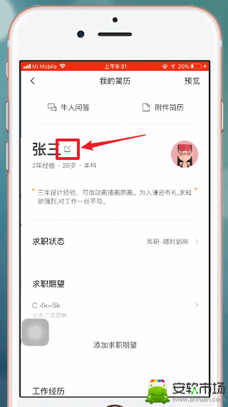 3、之后我们就会进入自己的页面,在这个页面中我们点击名字旁边的小笔图标,如下图。