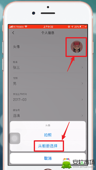 4、之后我们就可以点击自己的头像了,点击之后就可有从相册里面选择自己想要的头像。