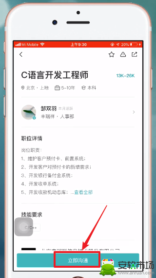2、点击之后我们就可以点击下方的【立即沟通】点击之后就会出现一个聊天页面。