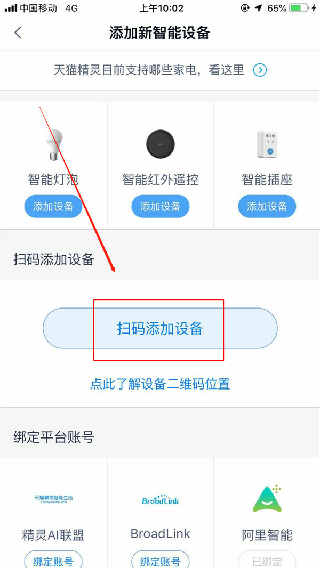 3、找到“扫码添加设备”并点击,然后扫描智能电视的二维码,根据提示连接即可。