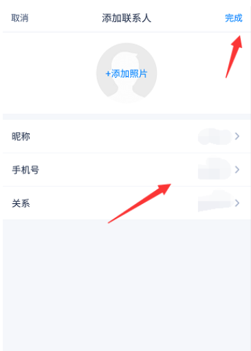 5、然后如如联系人手机号码和昵称即可点击完成。