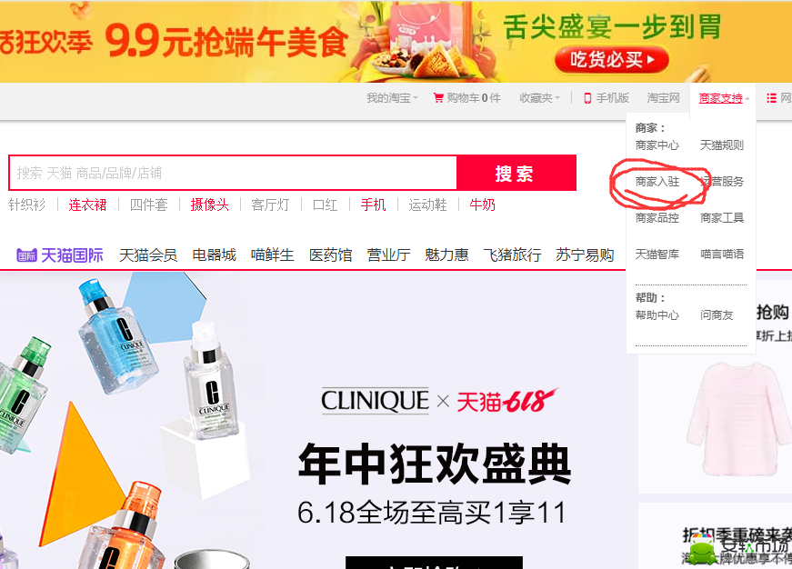 2、在网页中搜索天猫,进入天猫官网,点击右上角的“商家支持”中的“商家入驻”。