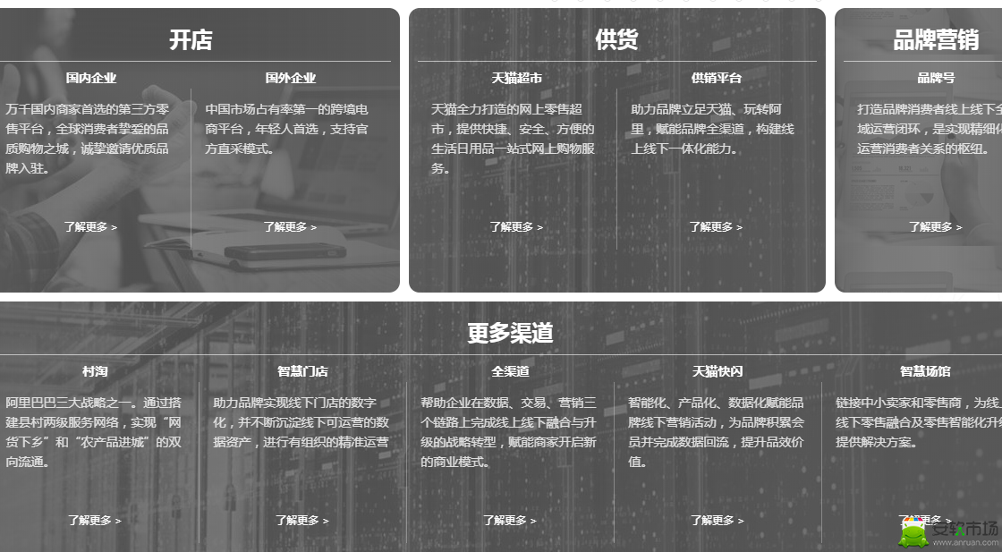 3、下拉我们可以查看一些关于开网店的信息和介绍,这对我们日后的开店有很大的帮助。点击第一块“开店”中的“了解更多”。