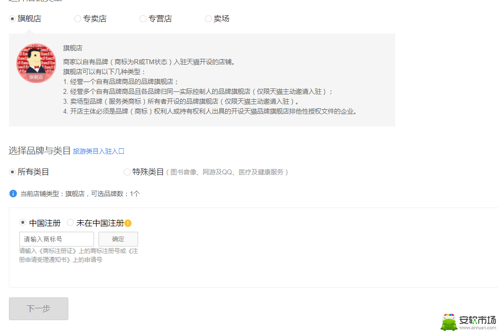 5、认真查看各类网店的要求,然后在下面进行注册商标。之后我们就可以等待审核了,大约在天猫7个工作日内给到审核结果。审核通过后还需要办理后续手续,步入说签署支付宝代扣协议、考试、补全商家档案,冻结保证金,缴纳技术服务年费,发布商品,店铺上线等。