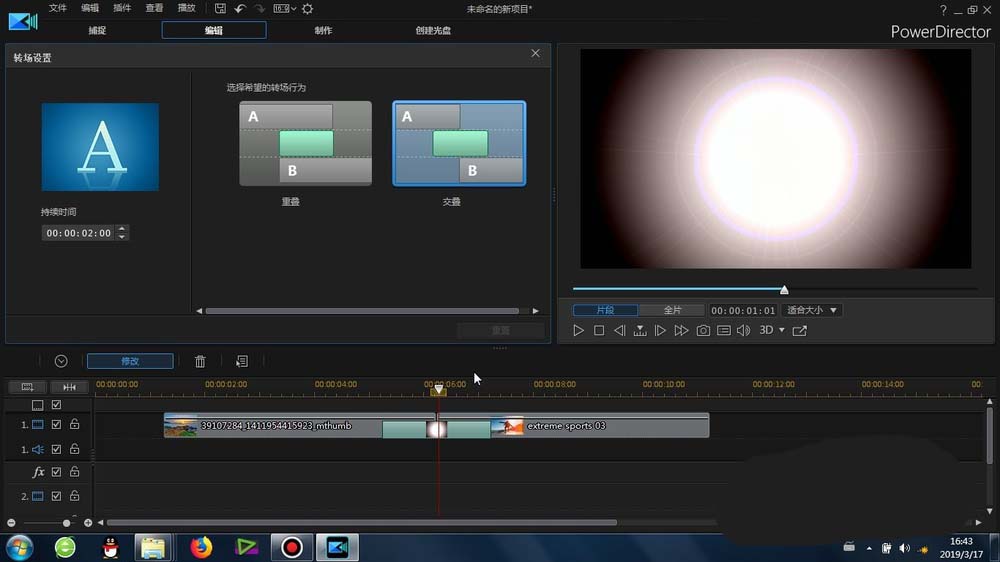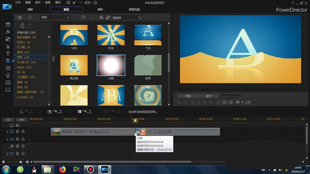我们先打开威力导演软件,然后就是光晕效果转场的位置是在:转场-常规里面可以找到
