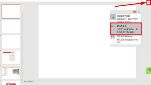 如何让他它们再显示出来呢?如果只想显示选项卡,仍然点击右上角的【功能区显示选项】按钮,在弹出的下拉菜单中选择【显示选项卡】。