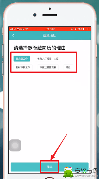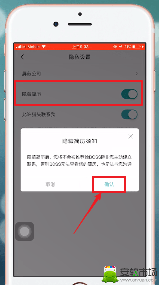 3、之后我们就可以把【隐藏简历】选项打开,点击【确认】