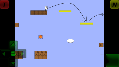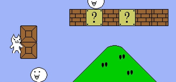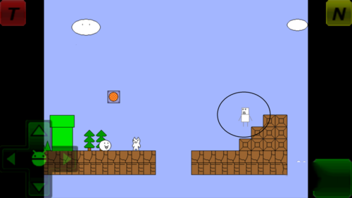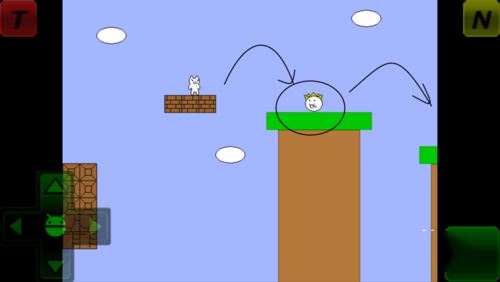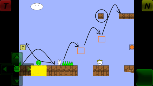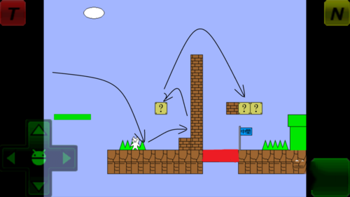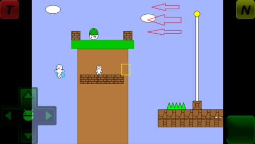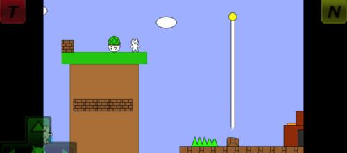 这里左侧的绿色踏板注意不能踩,触到它便会把猫里奥甩到下边去;并且这个图中带问号的方块是不能顶的,顶后吃掉长出的东西后会使所有可以踩的东西消息,就摔死了;跳过高墙后要注意左边红色区域的砖不能踩,是假的,会掉下去。拉掉小旗继续闯关即可;