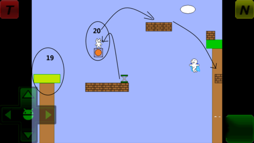 这里要注意,19处的高台是有弹性的,要注意掌握好不要弹下去死掉;同时20位置的小方块不能顶(同时小弹簧也不要用,会死掉的),这个不是以前遇到的过关提示,这个是会撞碎的,到时候你就会发现你上不去上边的路了;当到达上边的路后不要停,因为高处的一排砖会在你跳上去后下落,到达上侧后不要停的往前跑,也不要跳。你就会发现你正好沿着图中路线落到下边的砖上;