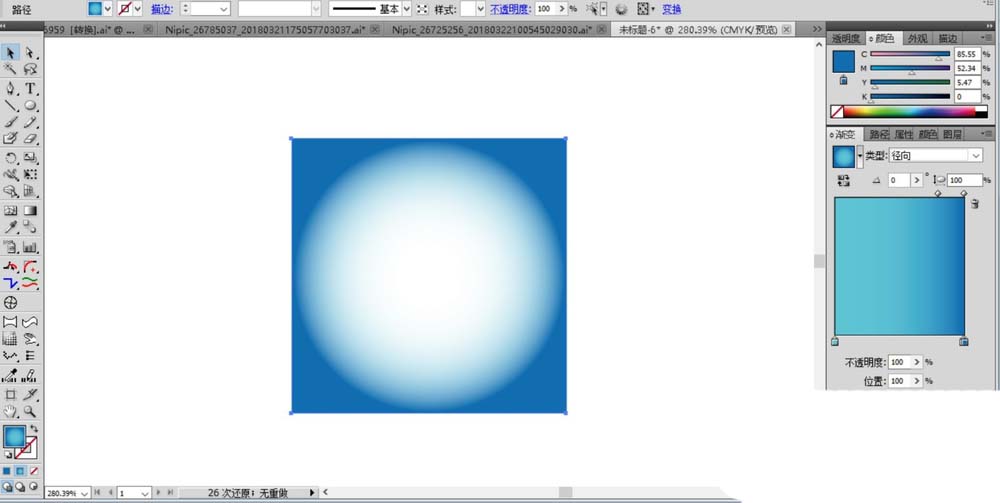 用矩形工具绘制一个正方形,用蓝白色的径向渐变填充。