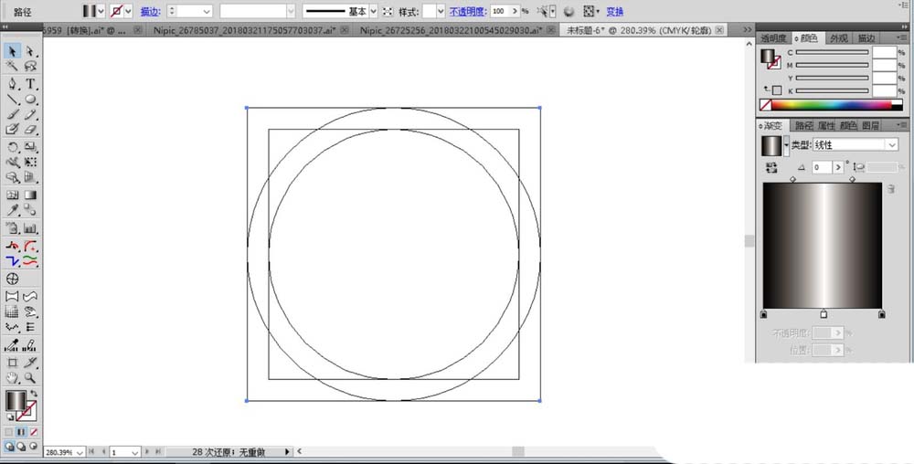 画出一个矩形并用灰黑色的渐变填充,用圆环的路径与这个灰黑色的渐变做一个剪切效果。