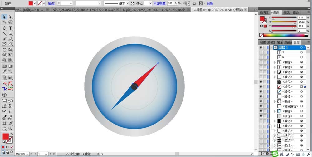 让指南针的外环也呈现出一种灰白色的钢材质效果。用钢笔工具画出指针的路径,用蓝色与红色搭配填充指针的两端,中间的圆形用灰黑色填充。