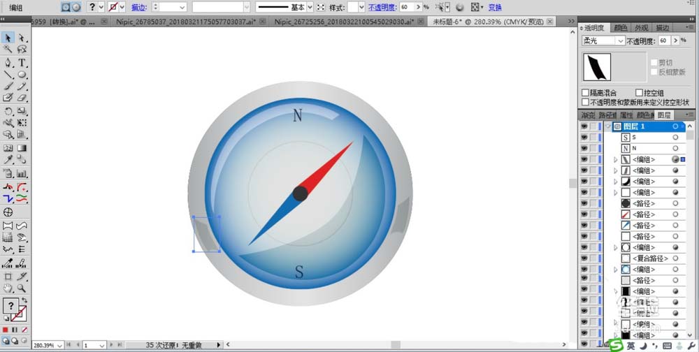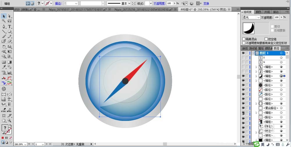 最后用钢笔画出指南针的旋转按钮的路径,用灰白色的柔光与灰黑色的柔光分别填充主体与暗区,从而完成指南针图片设计。