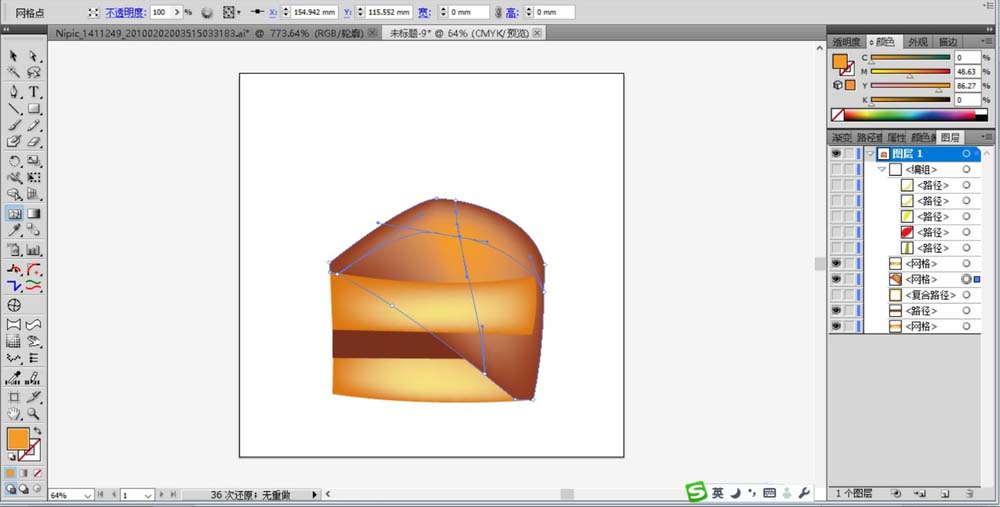 使用网格工具,用与背景色相近的黄色或者棕色来做渐变效果,让小蛋糕的表面材质呈现出来。