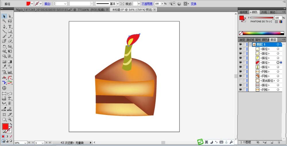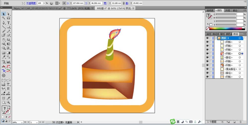 用网格工具给蜡烛的条纹与火苗分别做一下渐变效果,用矩形工具画出边框并填充橙黄色,小蛋糕图标设计结束。