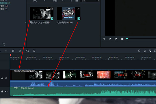 3、如果你想要在视频文件中加入自己需要的音乐,则需要将视频与音频文件拖动到下方的时间轴中,中间的图层是视频,最下面的图层是音乐,这样就成功在视频中插入音频文件啦!如下图所示: