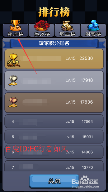 进入“排行榜”页面后,玩家会看到排行榜有能力榜、魅力榜、职业榜以及财富榜四个页面。点击“能力榜”进入到能力榜页面后,玩家就能看到自己所在服务器排名靠前的能力强人是哪些玩家。