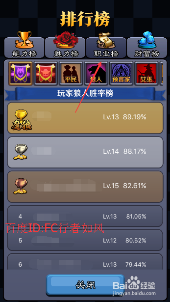 点击“职业榜”进入职业榜页面,在这里玩家分别可以看到狼人、好人、平民、预言家、女巫、猎人以及守卫等页面的玩家排名。