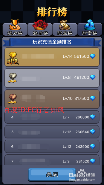 点击“财富榜”进入到财富榜页面,在这里就能看到所在服务器哪些玩家是最富有的。游戏中的财富主要看钻石的数量,而钻石玩家可以通过充值获得。
