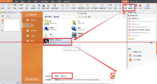 2、然后我们用wps将这个声音文件添加到ppt中,添加完成就ok了,你是要加背景音乐还是声音,这个按照您自己的需求即可!