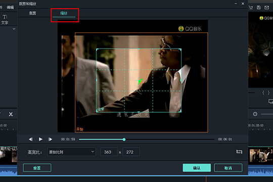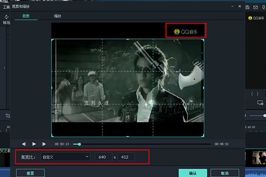 3、弹出裁剪和缩放的界面后,由于软件默认的高宽比是原始比例,不管怎么调整都是保持纵横比例的,所以需要将高宽比设置为自定义,并调整图中浅蓝色的框,使水印部分排除在选框之外,这样裁剪后的视频将不再出现水印部分,如下图所示: