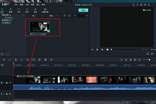 2、成功进入到软件的主界面之后,就可以开始导入你想要加入的那一段视频了,导入成功后将会在项目中出现可编辑的媒体文件,将此文件拖动到下方的时间轴中即可,如下图所示: