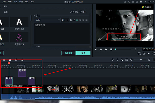 4、添加字幕后,当然是要对字幕文件进行编辑啦,在下方的时间轴中双击想要编辑的字幕,将会出现可编辑的文本窗口,选择合适的文字样式、字体大小与字幕内容,,如下图所示: