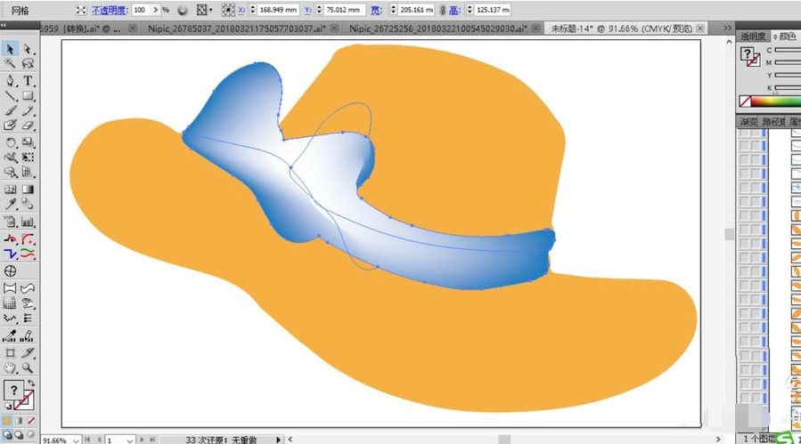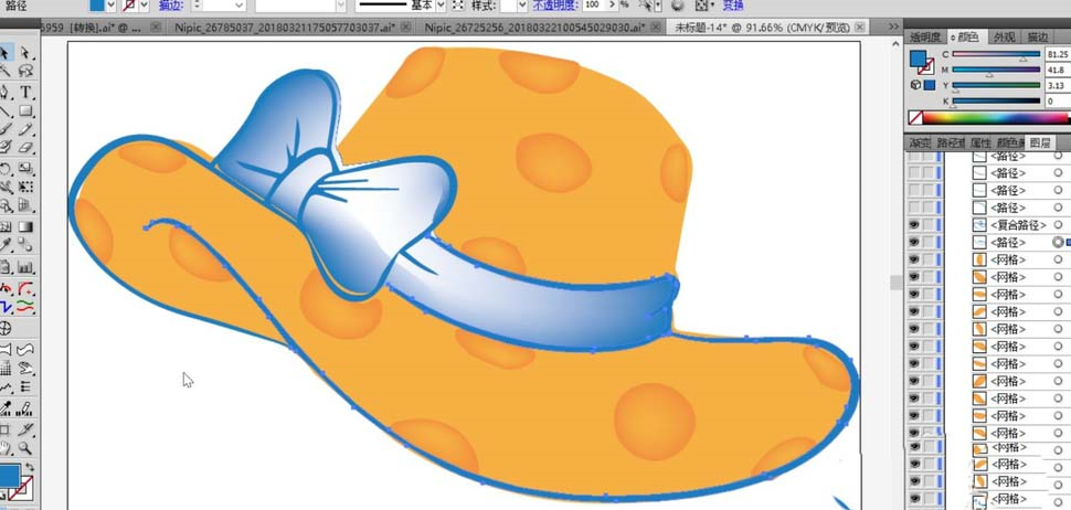 画出礼帽左侧一个蝴蝶结的路径与帽子的边缘路径。用海蓝色进行填充,并用海蓝色到白色的渐变填充,使用网格工具来完成。