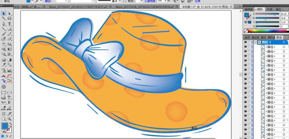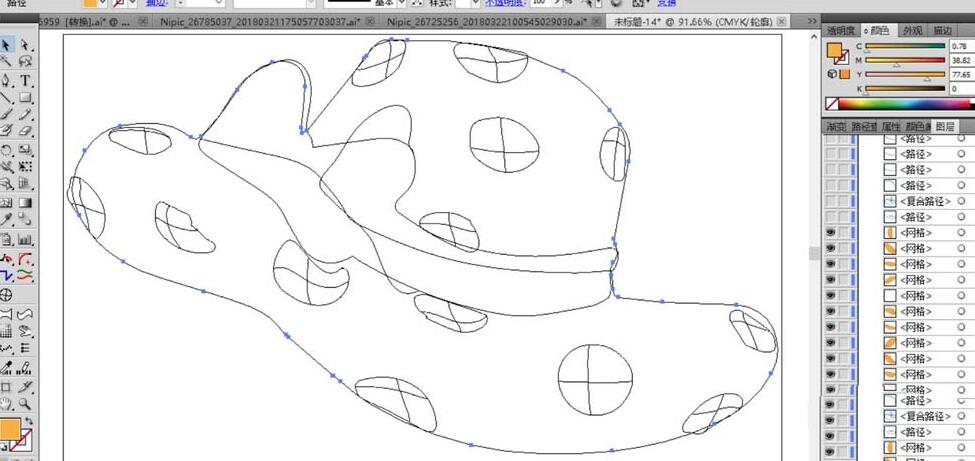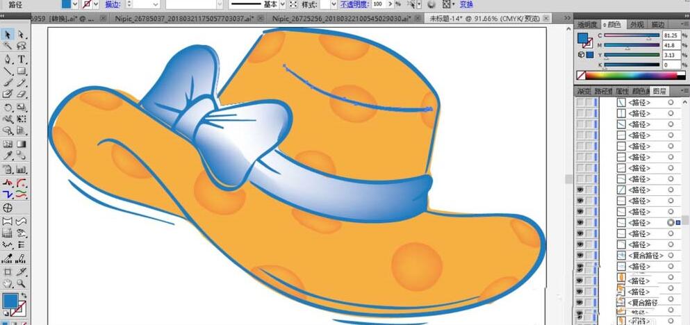 用圆形工具在礼帽上面画出很多不规则圆形的图案路径。