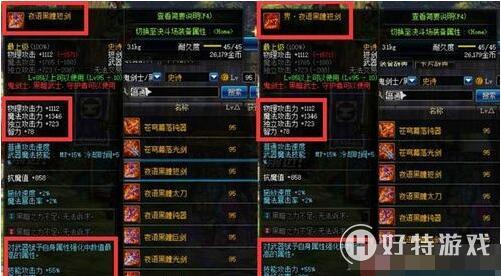 两把武器搭配在一起后,使用继承系统可以完美继承所有打造属性,附魔、红字、强化增幅等级。除此之外,这样继承以后的装备还能享受到界-夜羽黑瞳系列的所有特效和属性,例如瞬间移动、变大、回血聚怪等等效果。