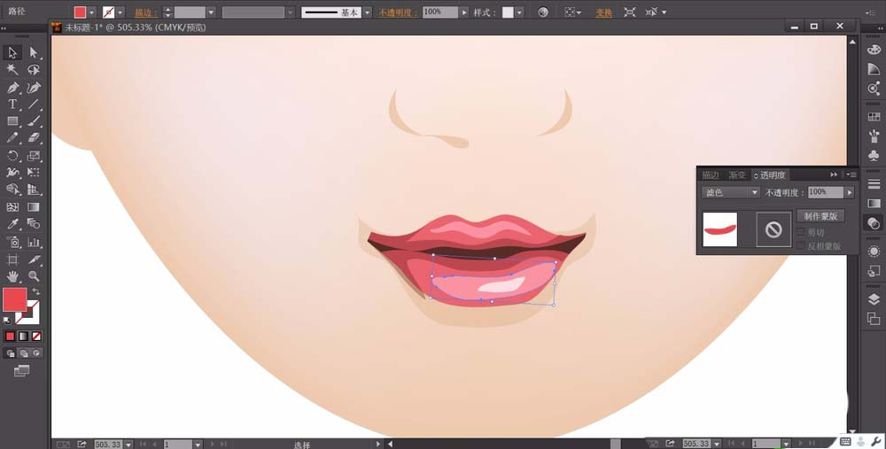 使用钢笔工具画出女孩的嘴唇路径,可以多绘制几个层次,从高光区域到暗光区域的路径都绘制出来,用红色的滤光效果填充高光路径,用红色填充主体路径,用暗红填充中间暗光路径。