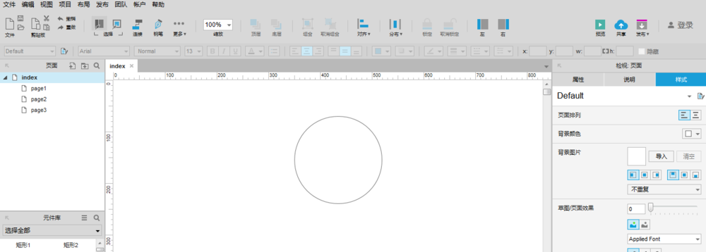 首先我们打开Axure RP 8软件,双击打开Axure RP 8设计软件,在基本元件中找到“椭圆形”,拖曳一个到画布上,如下图所示: