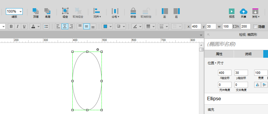 然后我们将椭圆形的高度和宽度改为200*100,让其看起来像一只气球,如下图所示: