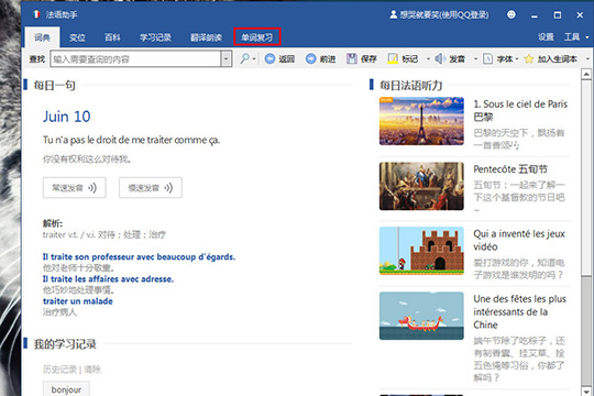 1、首先需要进入并登录到法语助手的主界面,用户可以在此软件中进行随时查询不认识的单词,如果你觉得自己已经掌握了一定的单词水平,想要对自己进行单词的相关“测验”,则可以进行复习,如下图所示: