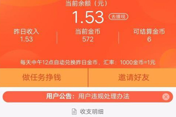 点击余额可以看到我们获取的金币以及现金明细,最上方有一个去提现,我们可以按照提示提现。