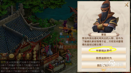 到了蒙面这里以后,我们点击蒙面,选择我要报仇雪恨,即可开启强杀开关,时间为一小时。