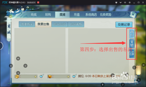 摆摊操作步骤四:最后玩家在背包中,或者宠物中选择游戏道具或者宠物进行上架出售即可。