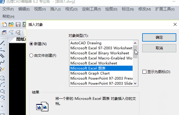 点击【新建】,在对象类型中任意选择一个Excel表格的类型,将一个新的Excel表格对象插入到CAD中。