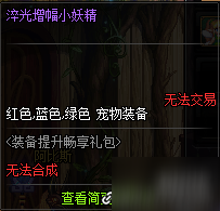 淬光小妖精宠物自选礼盒开启后,可以从淬光强化小妖精、淬光增幅小妖精、淬光锻造小妖精中,选择获得1个宠物。获得的宠物无法交易。