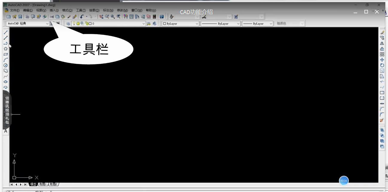 CAD操作界面分为三个部分,分别是上方的工具栏,两侧的操作选项栏和下方的命令显示栏