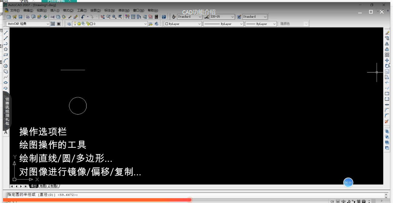 在绘制直线,圆和多边形以及对图像进行镜像,偏移,复制等都能在这里找到响应的选项,直接单击就可绘制